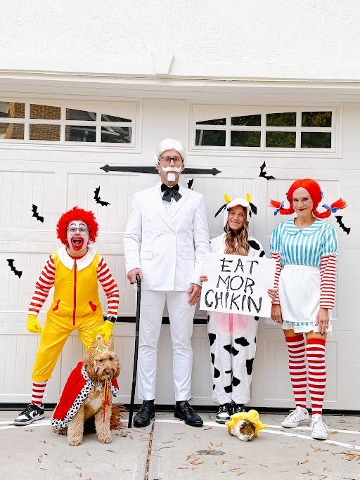 Our award-winning Fast Food Family Halloween costume featuring Wendy’s, KFC, Chick-fil-A, Hardee’s, McDonald’s, and Burger King — the ultimate drive-thru dream team.