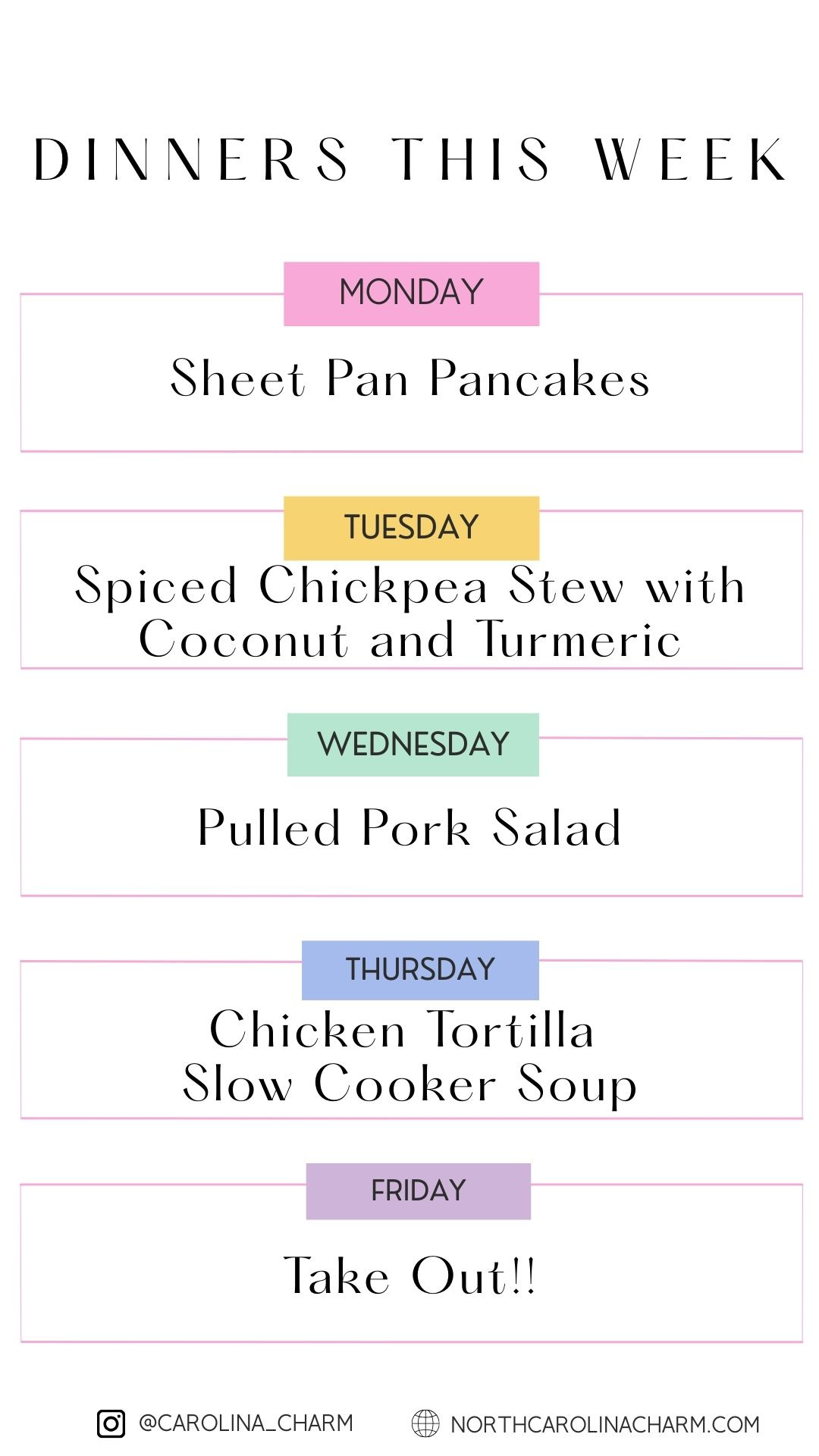 Sheet Pan Pancakes, Spiced Chickpea Stew with Coconut and Turmeric, Pulled Pork Salad, Chicken Tortilla Soup, Take Out!!
